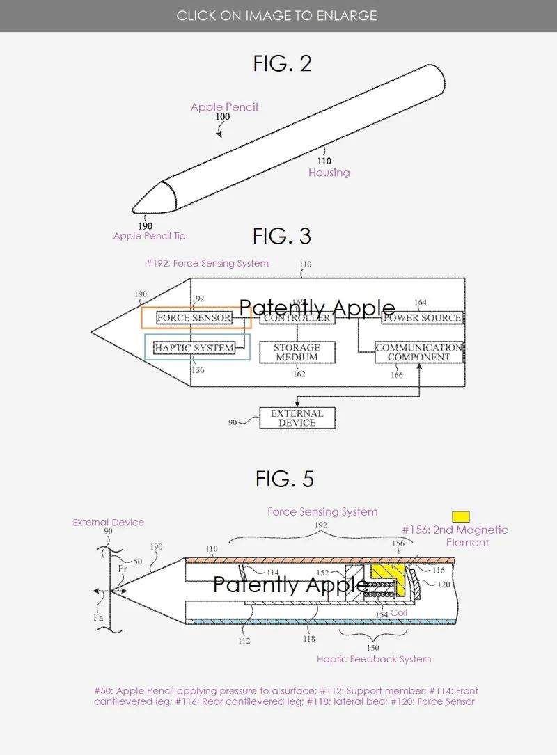 这一专利涉及了Apple Pencil未来可能会使用的高级触觉技术,它将为用户提供在纹理上书写或绘图的感觉。这并不是Apple Pencil首次涉足提供纹理触觉反馈的专利,这一项目早在2015年就已有两个类似专利公开。