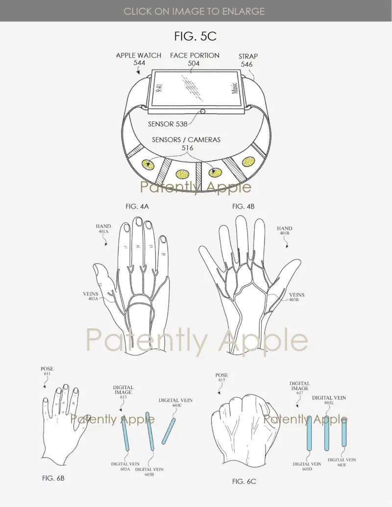 这项专利显示,未来的Apple Watch可以在表带底部搭载传感器或微型相机,以此来捕捉用户的静脉图像,继而自动识别出用户在VR/MR游戏中做出的特定手势。