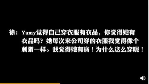 “她很丑,不时尚……原来只是一个伴舞而已”。在Yamy曝光的录音中,经纪公司老板徐明朝这样评价Yamy。同时一篇名为“我 到底是什么”的微博长文引起了公众的关注。在文章中,Yamy细数两年来自己在经纪公司受到老板徐明朝的极端对待,并且在提出解约后,收到对方“情况了解,不要作死”的回复。