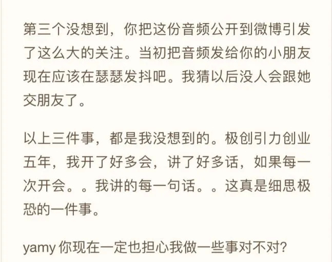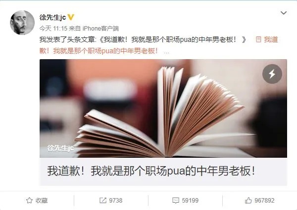 直到今早,徐明朝发表了头条文章:《我道歉!我就是那个职场PUA的中年男老板!》,承认前文的威胁意味和“职场PUA”行为,但却拒绝向Yamy道歉,理由是Yamy利用得到的内部会议音频和恶意剪辑,试图借助公众情绪,坐实解约。