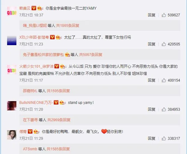 录音公开后,除了前火箭少女成员孟美岐、赖美云、演员王智、张嘉倪、池子、黄子韬等人发博力挺Yamy,网友也纷纷指责徐明朝的行为是“职场PUA”。
