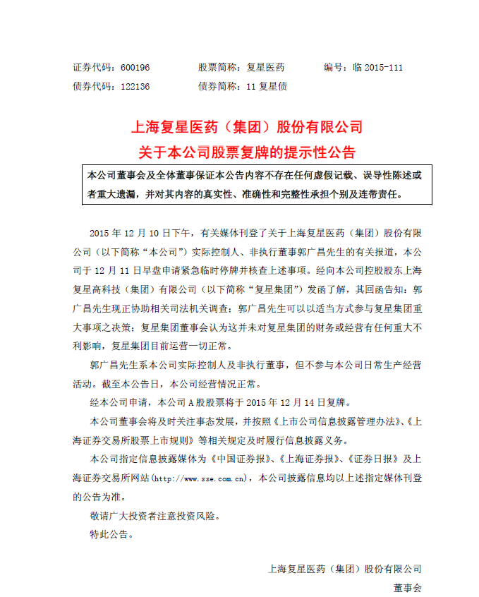 12月11日晚,复星医药(600196.SH)发布公告,证实复星集团实际控制人郭广昌正协助调查。