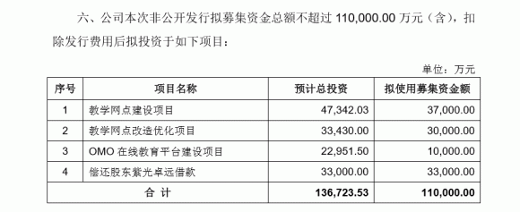 一是教学网点建设项目和教学网点改造优化项目。教学网点建设预计总投资金额为4.73亿元,使用募集资金投入3.7亿元,拟建设周期为3年。计划在未来3年内,在全国各级目标城市增设教学点共计176家。至于教学网点改造优化项目,预计总投资金额为3.34亿元,使用募集资金投入3亿元,拟建设周期也为3年。教学网点建设项目预计投入运营后,内部收益率为17.00%,税后静态投资回收期为5.36年;教学网点改造优化项目不直接产生经济效益。