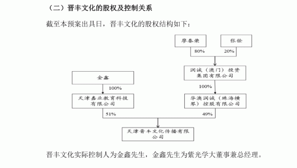 晋丰文化为公司董事兼总经理金鑫、董事廖春荣间接持股的公司,金鑫对晋丰文化拥有控制权。此次定增,金鑫将通过认购股份取得紫光学大的实控权。