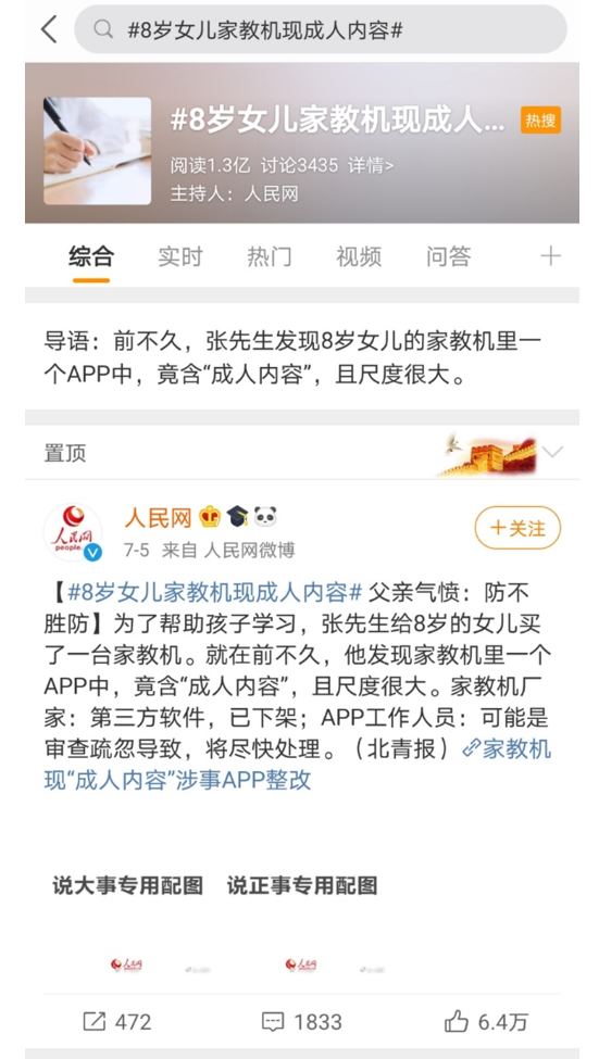 事件一经曝出,“8岁女儿家教机现成人内容”迅速以1亿多的阅读量上了微博热搜榜。