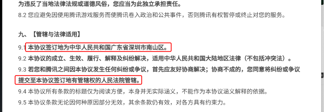 如国民游戏《王者荣耀》的用户协议中,腾讯公司即在管辖条款中约定,因用户协议引起的任何纠纷,应当提交协议的签订地(即深圳市南山区)有管辖权的人民法院提起诉讼。