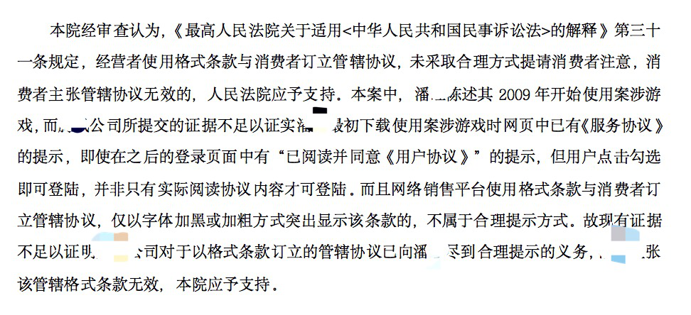 因此对于管辖条款的约定,游戏公司应该采取加粗、标红、下划线、特殊字体等各种方式显著提醒用户关于管辖的约定,在游戏公司用户协议通过加粗、标红等方式需要提醒的内容过多的,甚至可以考虑将管辖条款提至用户协议的最前方以做提示。