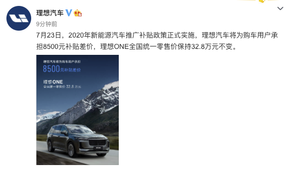 理想汽车官方微博消息,7月23日,2020年新能源汽车推广补贴政策正式实施,理想汽车将为购车用户承担8500元补贴差价,理想ONE全国统一零售价保持32.8万元不变。