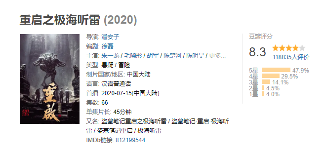近期在爱奇艺热播的《盗墓笔记》系列超级网剧《重启之极海听雷》就得到了完美展现。这部剧一开始被疯狂吐槽,没想到到上线后却神逆袭:话题#重启#一度在微博电视剧话题榜、微博剧集榜及超话电视剧榜均排名Top 1,豆瓣开分达到8.7分,并高居实时热门书影音榜单Top1。