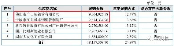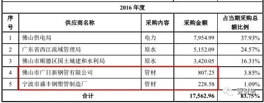 2019年招股书显示,2016年的前五大供应商及采购额分别为:第一名佛山市供电局7,954.99万元、第二名广东省西江流域管理局5,152.09万元、第三名佛山市顺德区国土城建和水利局3,420.05万元、第四名广日新钢管807.25万元、第五名宁波盛丰228.58万元。两份材料中,仅两家供应商相同,而采购额还存在出入。