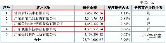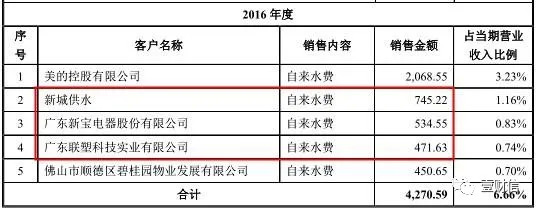 2016年前五大客户中,年报披露的客户名称及销售金额分别为:第一名佛山新城供水有限公司(下称"新城供水")745.22万元、第二名广东新宝电器股份有限公司(下称"新宝股份")534.48万元、第三名广东美的物业管理股份有限公司445.91万元、第四名广东联塑科技实业有限公司(下称"联塑科技")437.57万元、第五名广东美的制冷设备有限公司410.82万元。