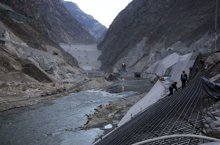 一座即将完工的大坝横亘于崇山峻岭之间,它最高点可达220多米,高度相当于70多层楼房。在它背后,碎石、废料散落一地。挖掘机在碎石之上不停地挥舞着巨大的机械臂,一辆辆重载卡车发出沉闷的轰鸣,在颠簸不平的山路上驶过。距离大坝比较近的山体上,一些工人们在做着加固工作。