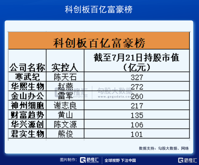 数个百亿富豪已经诞生。据格隆汇整理,截止7月21日,已经有7位企业实控人登顶科创板百亿富豪,按顺序排列,分别是寒武纪、华熙生物、金山办公、神州细胞、财富趋势、华兴源创、君实生物的实控人。