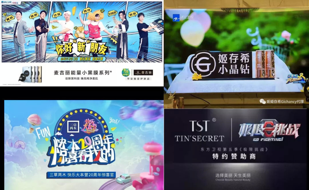 除了梵蜜琳以外,其实近两年有很多微商品牌开始利用综艺冠名来打广告,追求品牌曝光、知名度提升,同时,用微商的行话来说,也是制造素材。比如姬存希就参与了《奔跑吧4》、《创造营2020》、《亲爱的客栈3》、《中国好声音2019》等节目的赞助;三草两木参与了《快本》、《向往的生活2》等;以及麦吉丽、一叶子、膜家、美颜秘笈、TST面膜、英树、奢悦、倾沐等均参加了不少省级卫视播出的综艺节目,像最早的韩束也是。