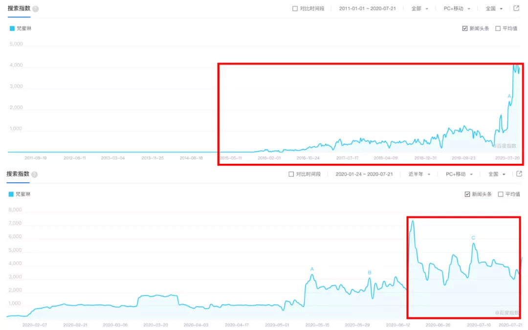 根据百度搜索指数来看,上图可以看到梵蜜琳从2015年开始成立,成立后一直波澜不惊,从去年开始慢慢有一点关注,直到今年6月中旬《乘风破浪的姐姐》播出,梵蜜琳这才被大众注意到,迎来了一个逆势攀升。