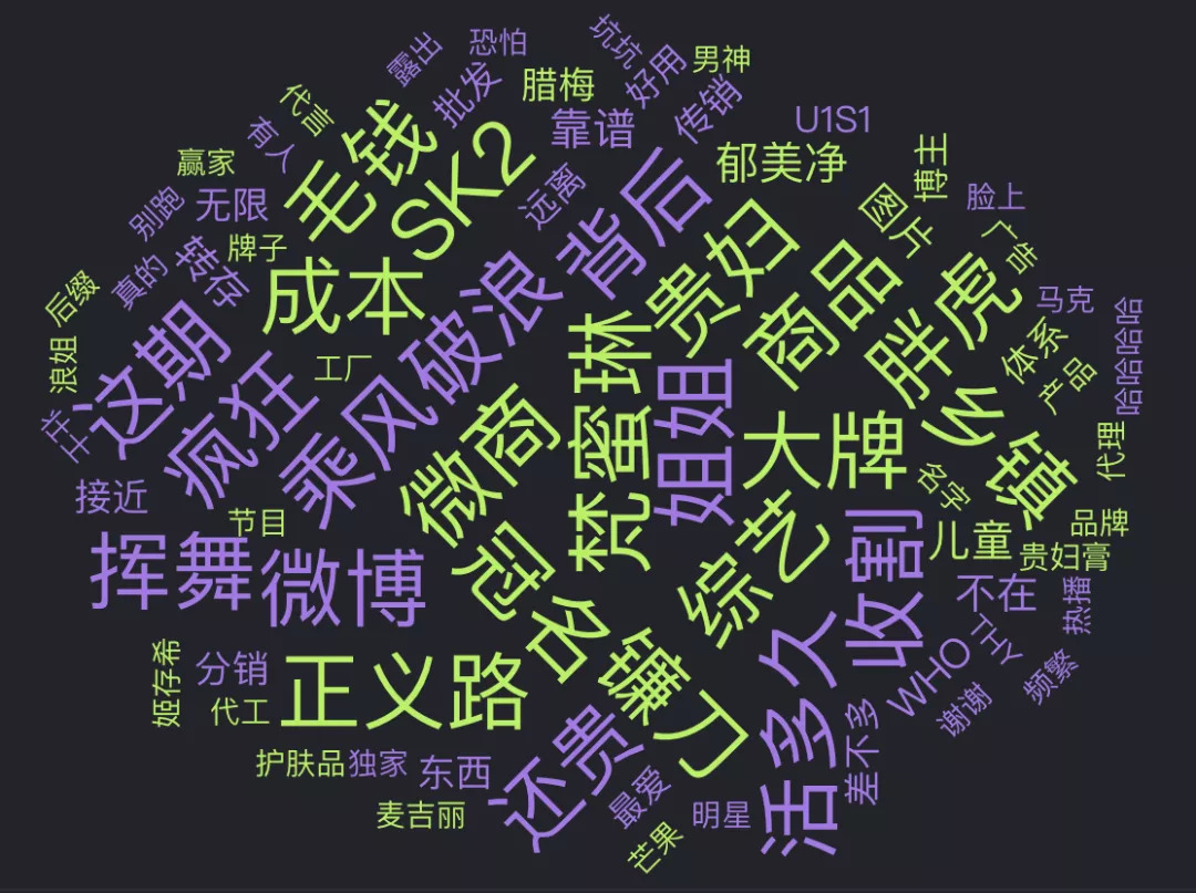另一方面,根据时趣洞察引擎显示,在节目播出后,微博网友针对于梵蜜琳的讨论关键词大多是“微商”、“镰刀”、“活多久”、“乡镇”以及一些国际大牌,可见大众们对于梵蜜琳品牌还是抱有一些怀疑、不信任、低端等消极态度。