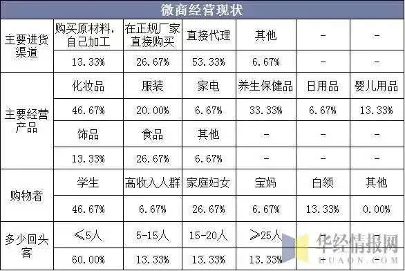 2.根据华经情报网数据显示,目前微商经营现状,化妆品占比46.67%、服装占20%、养生保健品33.33%、家电6.67%、婴儿用品13.33%、饰品13.33%、食品26.67%以及其他占6.67%。