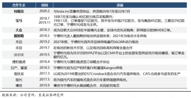 过几年,宁德时代与上汽、广汽、吉利、东风、一汽等头部自主品牌均建立合资公司,还与特斯拉、宝马、大众,乃至戴姆勒等国际巨头签署了相应绑定协议。
