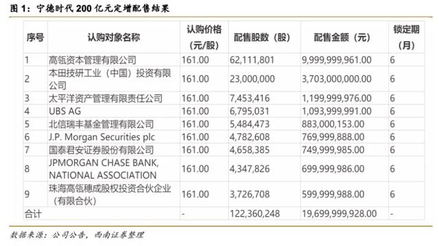 此次定增,宁德时代最终发行价格为161元/股,较发行底价129.67元/股,溢价24%。在认购对象中,除了本田是实业投资者,其他均为金融机构,包括高瓴资本、太平洋资管、国泰君安等。