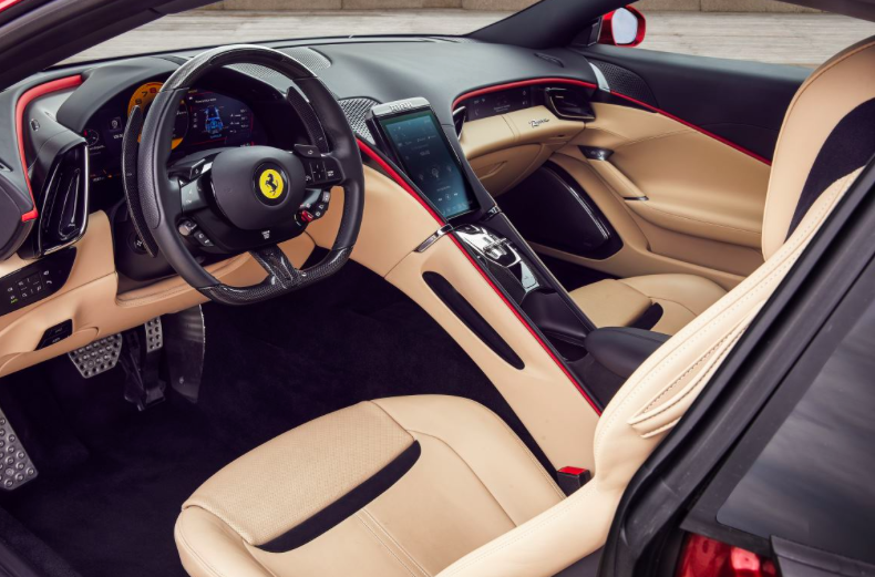 双驾舱概念为副驾驶的前方也配备了一块多功能液晶屏幕,让副驾驶也有了参与感,有更深的乘坐体验。Roma用了最独特的内饰材料:全粒Frau皮革、Alcantara座椅包裹、镀铬铝和大量的碳纤维,来体现整车内饰的奢华。