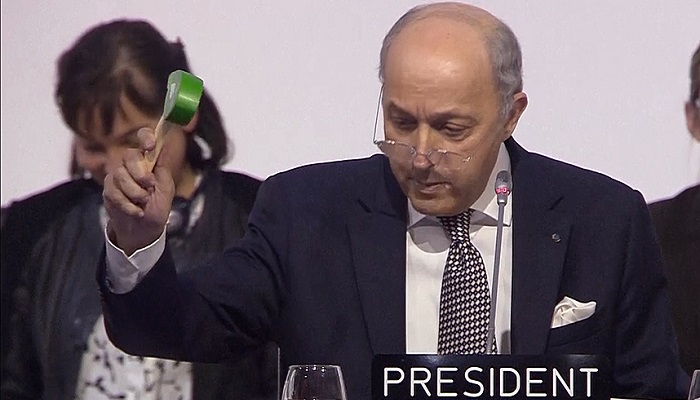 法比尤斯敲下小木槌正式宣布《巴黎协议》获得通过时,在场的谈判代表们爆发出热烈掌声,法比尤斯说:“这是一个小木槌,却能干大事。”
