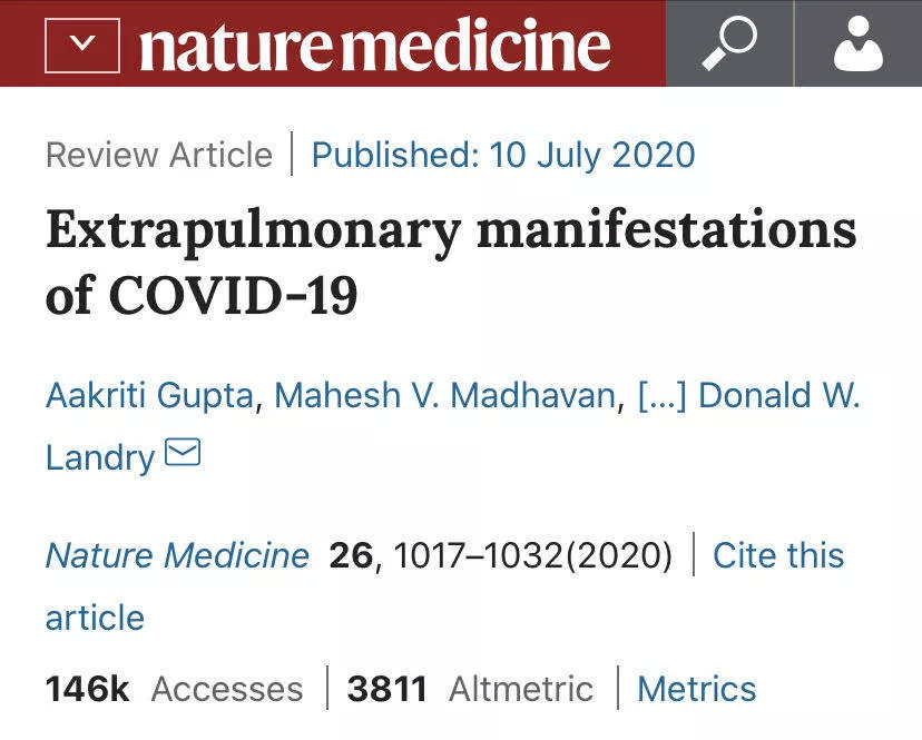 众所周知,肺部是COVID-19的主要攻击目标,随着研究的深入,病原体对不同器官的影响也被逐渐证实。近日,来自纽约市哥伦比亚大学欧文医学中心研究人员在《自然》杂志上发表了一篇研究报告。该论文详细介绍了感染COVID-19后可能出现的所有肺外健康问题,并给出了完整的管理建议。