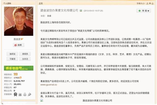 十年后路金波和韩寒母亲周巧蓉共同发起创立了如今的果麦文化。并签约易中天、张怡筠、韩寒等作家,组成了来自不同写作内容的“金牌写手”阵容。