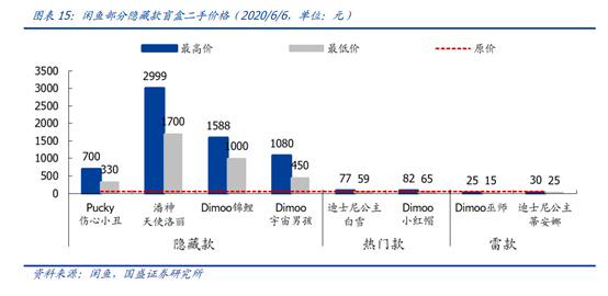所谓盲盒,指的是同一批次的盒子采用统一包装、尺寸和定价,外部没有款式标注说明,产品随机,也就是说消费者在打开盒子前并不知道自己抽中什么款式。泡泡玛特盲盒装着高约4.5cm-9.5cm的玩偶,单价49-99元。通常一个系列盲盒12个,同时还搭配一个不公开的隐藏款,抽中隐藏款的概率为1/144。隐藏款因稀有性,更具投资和收藏价值,在二手交易平台上最高从59元暴涨至2350元,溢价高达39倍。