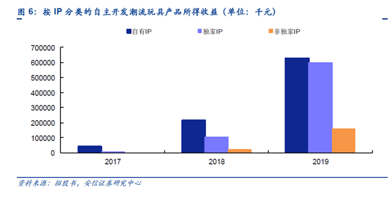 以Molly为例,泡泡玛特于2016年获得Molly IP形象的独家版权,此后投入量产,成为公司的收入支柱,2017至2019年累计贡献了7.11亿元营收。此外,泡泡玛特还研发了Dimmo、BOBO&COCO、Yuki等IP形象,同时还拥有PUCKY、The Monsters 等独家IP。