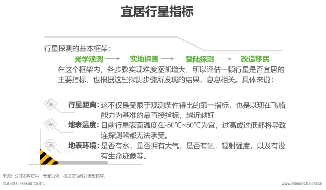 2020年7月为新一轮火星探测时间窗口,欧洲、俄罗斯、美国、中国还有阿联酋,都规划了独立的火星探测任务,中国天问一号任务力求一次性实现“绕落巡”三大任务,完成五项重大科研目标。而美国更是搭载了截至目前人类最高技术结晶的火星探测器。由于疫情的原因,欧洲与俄罗斯的火星探测任务宣布推迟,但依然会有三个独立的火星探测器在7月后飞向太空。如前文所述,行星探测如果想在本就捉襟见肘资源面前,申请到更多支持,则需要一系列的评价指标,以证明探测目标对人类太空移民的可行性。行星探测按照所探行星的位置,可以分为两个大分支,这两个分支因为技术上的鸿沟,在探测手段上完全不同。第一个分支是太阳系内的行星探测,第二个分支是太阳系外的行星探测。我们常规意义上看到的行星探测,都属于第一个分支,而媒体报道出来的在遥远的未知空域发现类地行星,亦是根据现有太阳系内行星探测的天文知识进行的推测。而无论系内还是系外,判断一颗行星是否适合人类居住,主要有以下几个指标: