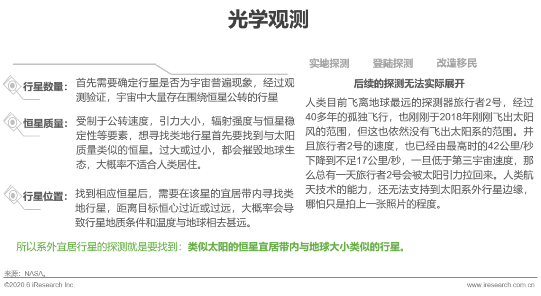 1995年10月6日,日内瓦大学的米歇尔·麦耶及戴狄尔·魁若兹宣布首次发现一颗普通主序星(飞马座51)的行星,这一发现极大拓展了人类文明甚至于地外文明延续和存在的范围与潜力,也由此赋予了深空探测多一重意义。在飞马座51的观测中,科学家使用了恒星摆动的观测技术,由于行星引力对恒星的影响,会导致恒星出现微小的摆动,使得恒星光波长被压缩。该方法在当时获得了普遍认可,自那时起地外行星的发现几乎全部依靠这种方法。也就是说,以目前人类太空望远镜的能力,无法直接看到环绕太阳系外行星的真实面貌,一切都是“推测”。在过去,受制于观测技术,这种方法只能找到大质量的行星,实际上对于系外宜居行星的探索没有帮助,但随着技术的精进,我们已经可以找到与地球质量类似的行星了。总体上看,太阳系外行星探索并评估宜居行星的逻辑框架如下: