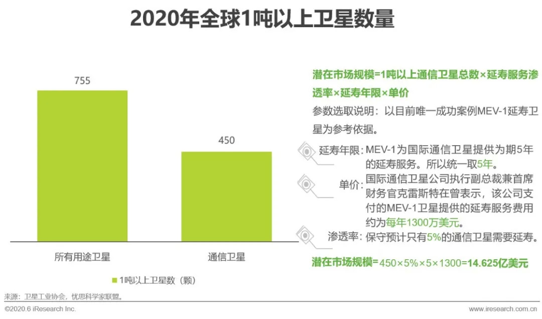 截至2020年4月,全球共有2665颗卫星在轨工作,其中1吨以上的卫星有755颗,其中通信卫星450颗,未来这些1吨以上的大卫星,都是卫星运维服务的主要需求方。为了客观严谨,在我们对未来市场规模的核算中,以最保守的通信卫星为主要受众,其它类别卫星暂不做考虑。但未来卫星延寿服务不可能仅局限于通信卫星,原因在于,目前低轨卫星星座成为热点,并且2017到2019年,这三年时间,600公斤以下的小卫星每年以300颗以上的数量被发往太空,比之前时期增加了1倍多,这对大质量通信卫星的发展有一定制约。而每颗重量300公斤左右的小型通信卫星,无论是技术上还是成本上,当下都不支持延寿服务。另一方面,通信卫星之所以成为首批服务对象,源自于其制动方面的特性,所以理论上与通信卫星具备相同特性的卫星,都可以延寿。