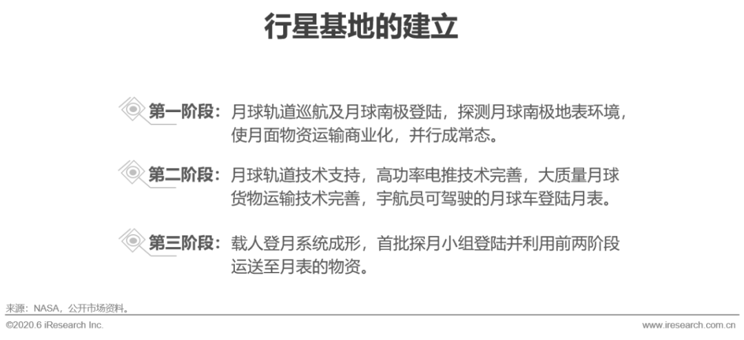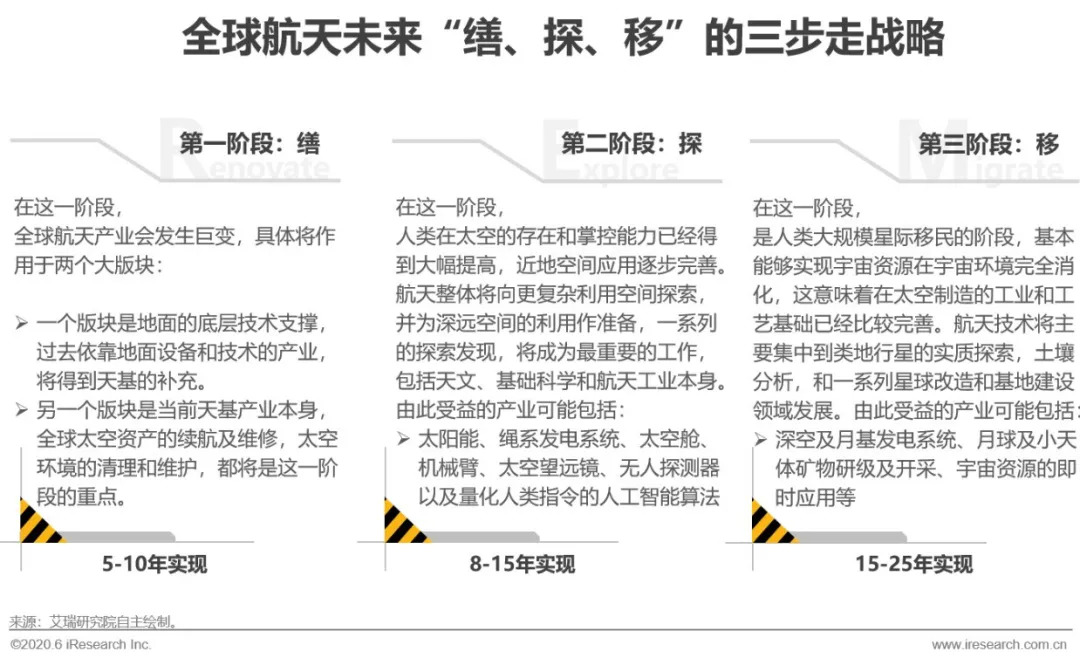 人类探索宇宙的目标是走出地球摇篮,整体上会呈现出从近地到深空,从简单到复杂的产业发展趋势。所以在不同阶段会经历三个重要时期。分别是以太空资产运维和续航为主的第一阶段“缮”;以地外环境探索和复杂应用空间为主的第二阶段“探”;以及以星际旅行和移民为主的最终阶段“移”。