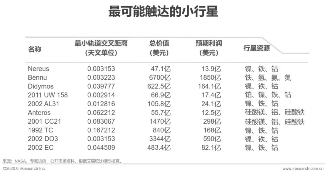 目前人类已知的所有小行星中,有诸如谷神星、爱神星等未来殖民和开采为目标的知名行星,以这些行星本身矿产资源来看,排名前十的小行星总价值超过了1000万亿美元,再加上其殖民与地外生存价值实际上想客观评估已不太可能。我们选取了一些与地球最小轨道交叉距离较近的10颗小行星,由于这些小行星存在与地球“擦肩而过”的可能性,所以理论上有触达的机会。换言之,这些小行星资源在第一轮太空移民潮中,将成为首批开采目标。