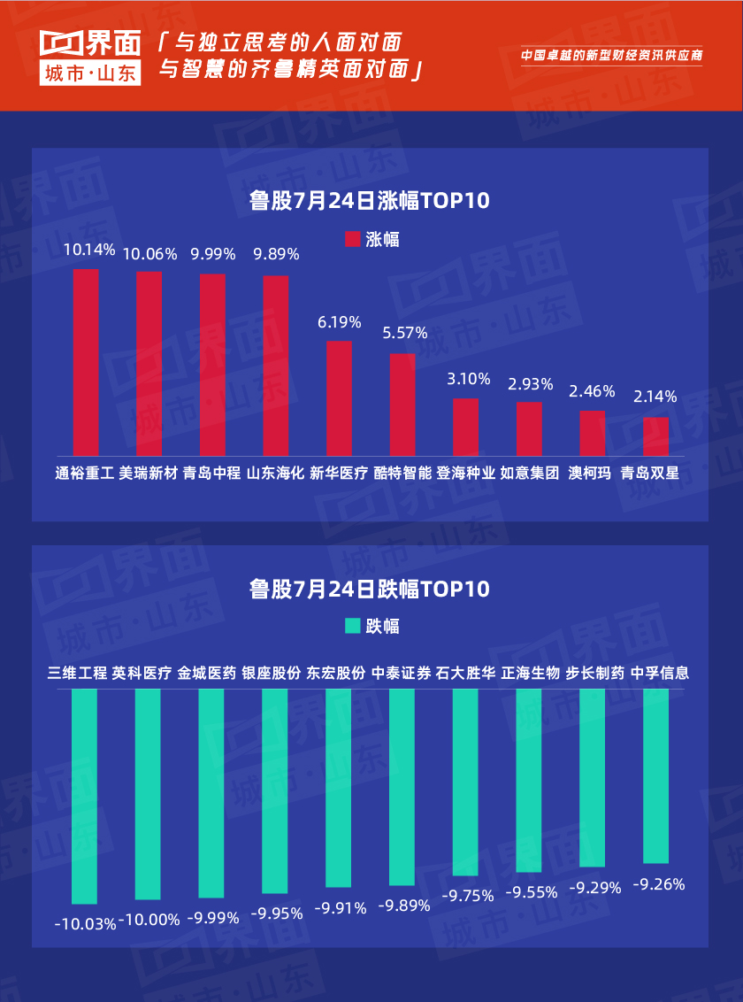 受大盘影响,7月24日,山东省内沪深股票有195只个股下跌,21只上涨,其中三维工程、英科医疗、金城医药、银座股份等四股跌停。