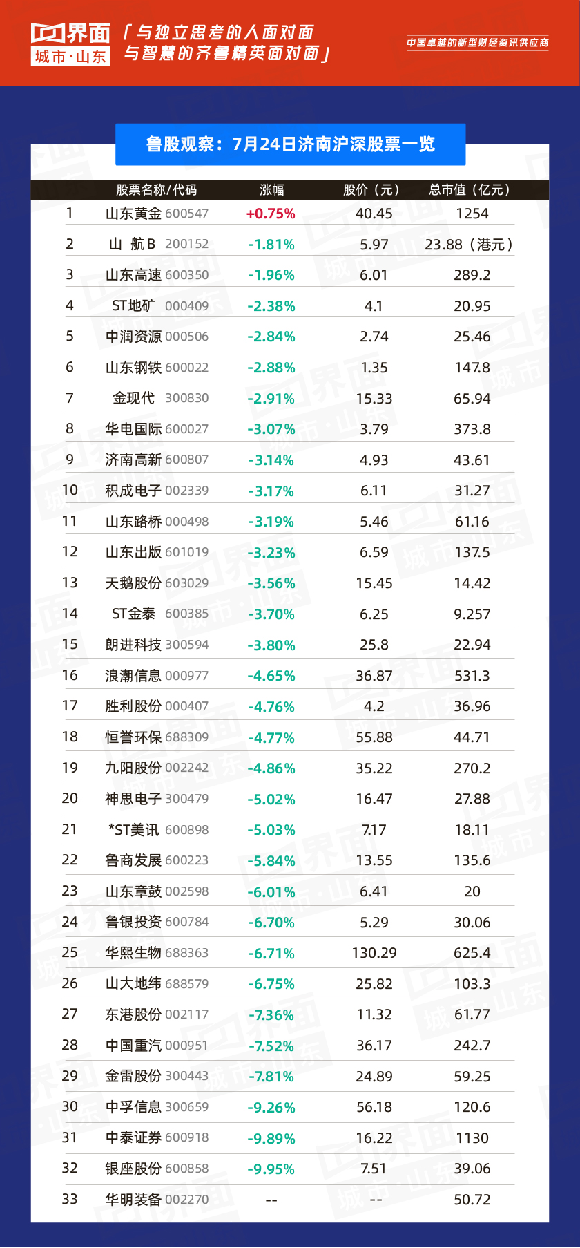 7月24日,山东省内沪深股票有195只个股下跌,21只上涨,1只与上一个交易日收盘价持平;总市值过千亿的有万华化学(600309)、中泰证券(600918)、海尔智家(600690)、山东黄金(600547)、潍柴动力(000338)、歌尔股份(002241)、青岛啤酒(600600)共7家,500亿-1000亿的共有3家,分别是中航沈飞(600760)、华熙生物(688363)、浪潮信息(000977)。