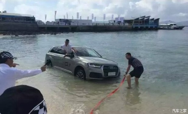 在媒体记者的试驾环节,一辆奥迪Q7陷入海边的沙滩动弹不得。好在借助其他车辆和工具后,这辆车最终成功上岸。
