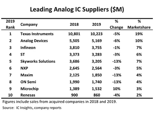 ADI和美信,都是模拟芯片领域的头部玩家。在IC insights发布的2019年度全球模拟集成芯片厂商排名中,ADI排第二,美信排第七。