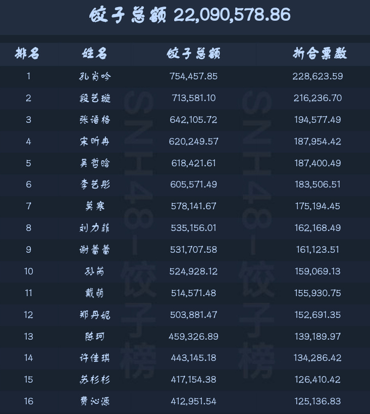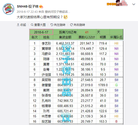 7月12日,总决选投票速报出炉,TeamNⅡ成员陆婷暂居第一位。从总选启动至今不足两个月,饺子榜集资总额已达2767万元。