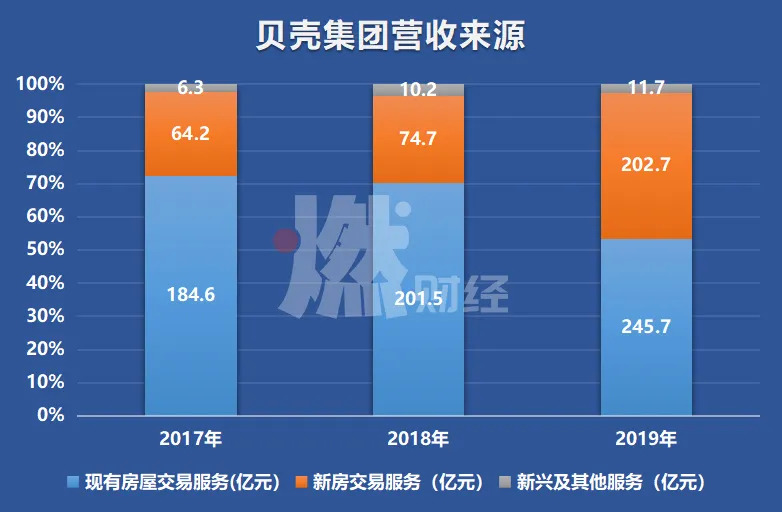 从数据来看,近三年来,二手房交易服务带给贝壳集团的收入逐步下降,新房交易带来的营收比例越来越高,到2019年,新房收入占比达到了43.9%。