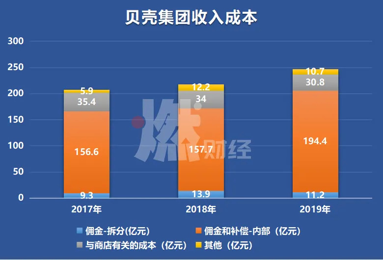 由于房产领域的特殊性,高客单价的房产成交同时也伴随着高昂的成本,也就是房产销售的佣金。因为贝壳的平台属性,佣金成本也分为对代理商和对内两部分。