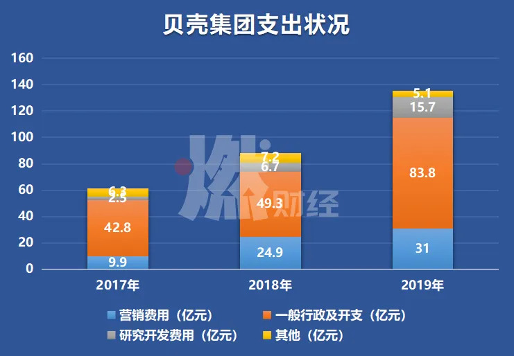 除了收入成本,贝壳集团也和一般企业一样,需要支出营销费用、一般行政开支和研发费用等。招股书显示,贝壳的营销和研发费用占比不大,也相对稳定,占比最大的是一般行政及开支。