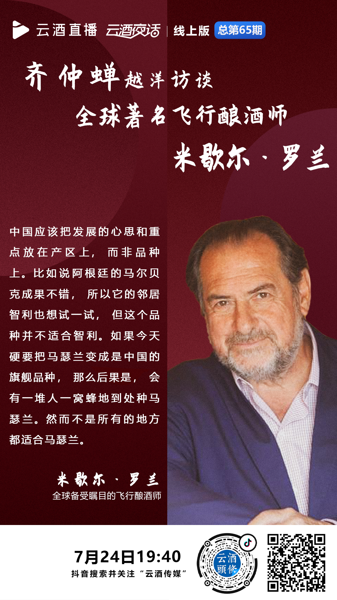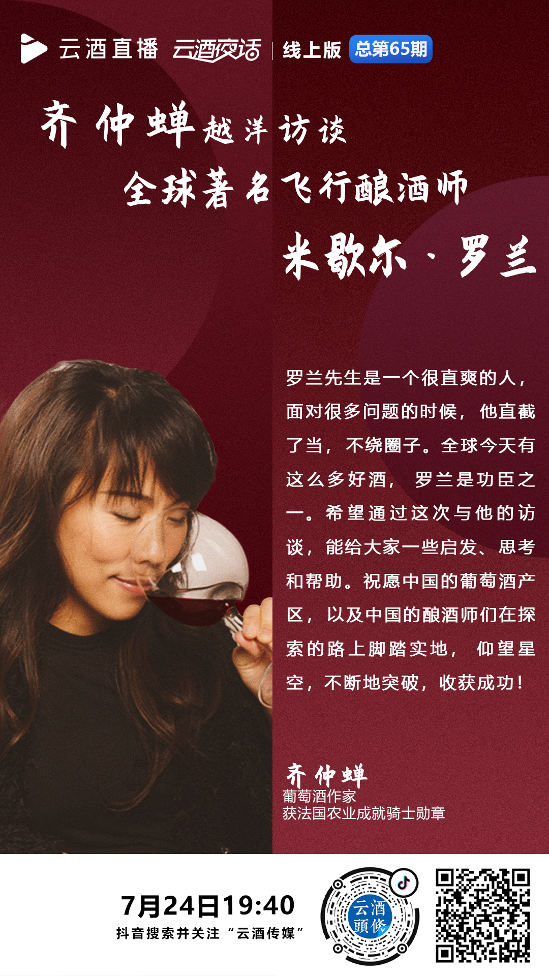 当晚,身在泰国的著名葡萄酒作家、获法国农业成就骑士勋章的齐仲蝉(Chantal Chi),作为云酒直播·云酒夜话特约节目制作人兼访谈嘉宾,越洋连线远在法国的全球著名飞行酿酒师米歇尔·罗兰(Michel Rolland)。