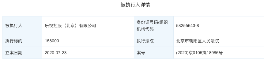 天眼查数据显示,7月23日,乐视控股(北京)有限公司因与北京科计通电子工程有限公司相关承揽合同纠纷被北京市朝阳区人民法院列为被执行人,案号为(2020)京0105执18986号,执行标的为158000元。
