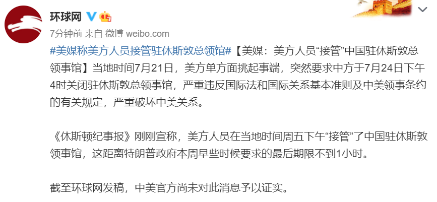 环球网援引《休斯顿纪事报》消息,美方人员在当地时间周五下午“接管”了中国驻休斯敦领事馆,这距离特朗普政府本周早些时候要求的最后期限不到1小时。