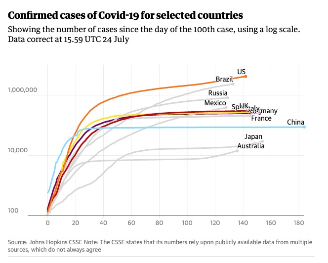 路透社的统计显示,过去一周有将近40个国家刷新了日新增确诊病例数的最高纪录。这个数据进入7月份以来一直稳步增长,第一周有7个国家报告了疫情爆发以来的单日最大增幅,第二周增加至13个,第三周20个,第四周则迅速涨至37个。