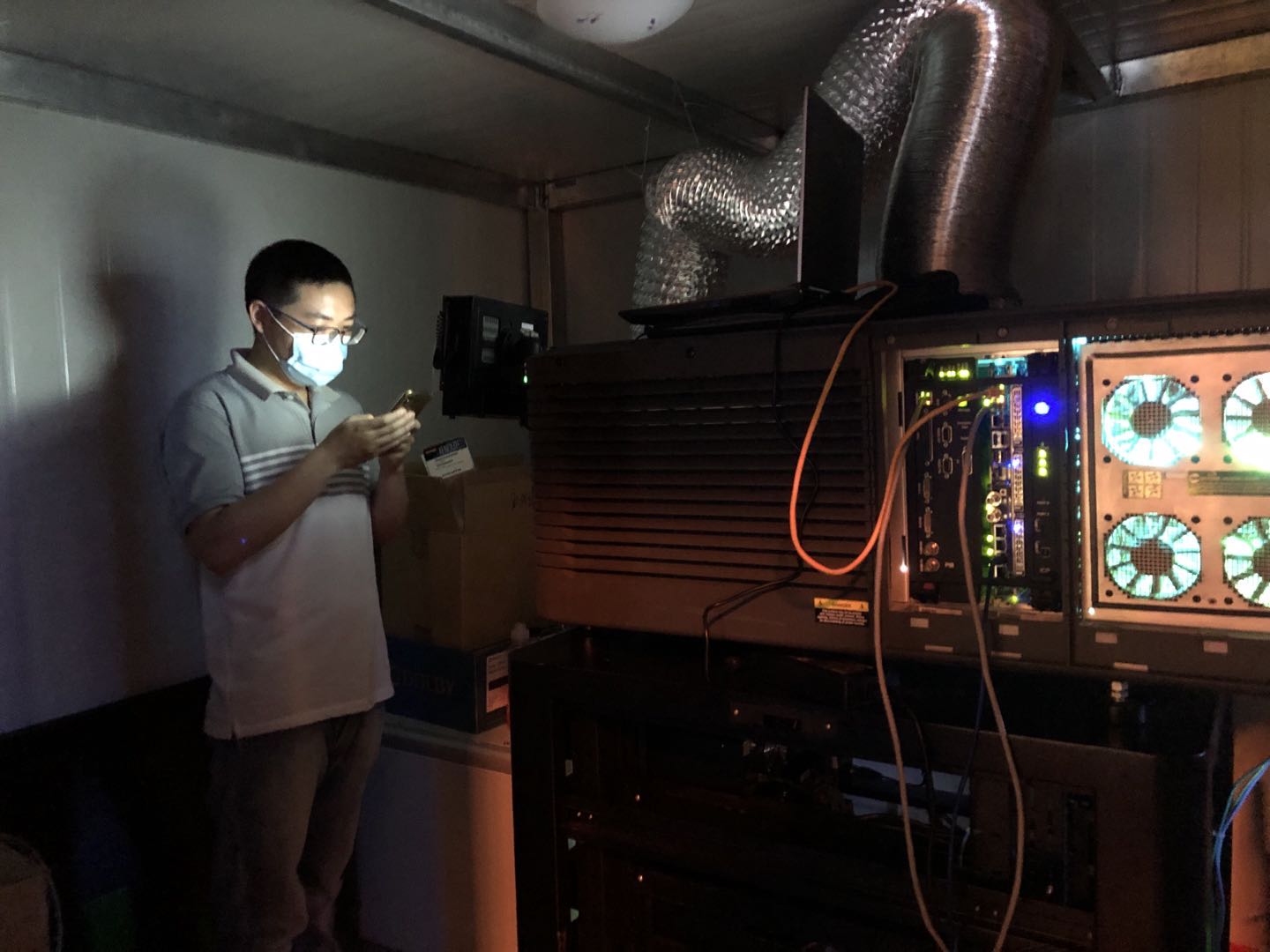 为了避免下雨对设备造成损害,主办方临时搭起了一处活动板房充当放映间。唯一的一根风管是给设备通风降温的,加之机器仍在不断散发热量,放映间内闷热难当。