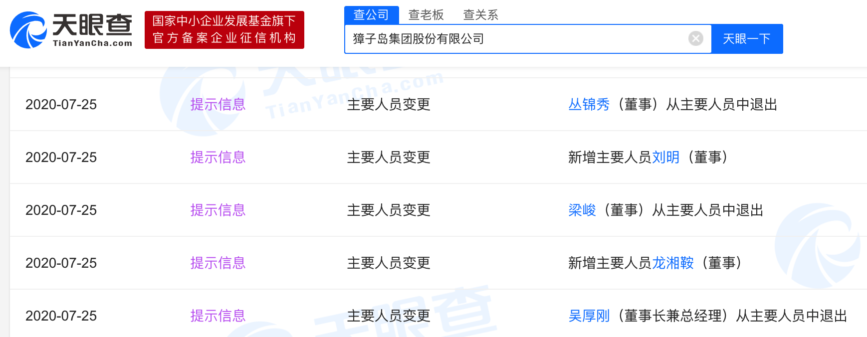 天眼查数据显示,7月25日,獐子岛集团股份有限公司发生一系列主要人员变更,吴厚刚卸任董事长兼总经理,唐艳接任董事长;董事梁峻从主要人员中退出。7月24日,法定代表人从吴厚刚变更为唐艳。
