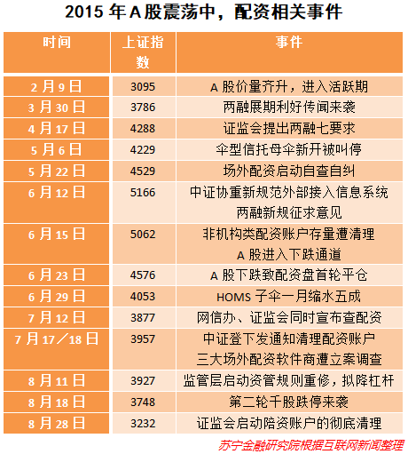 从上表可以看出,在配资的作用下,A股用短短的4个月时间从3000点飙升到5000点。随着配资风险逐步暴露,监管层采取了逐步严厉的降杠杆措施,以控制风险。A股也在6月中旬进入下行通道,并在8月底基本回到原点。
