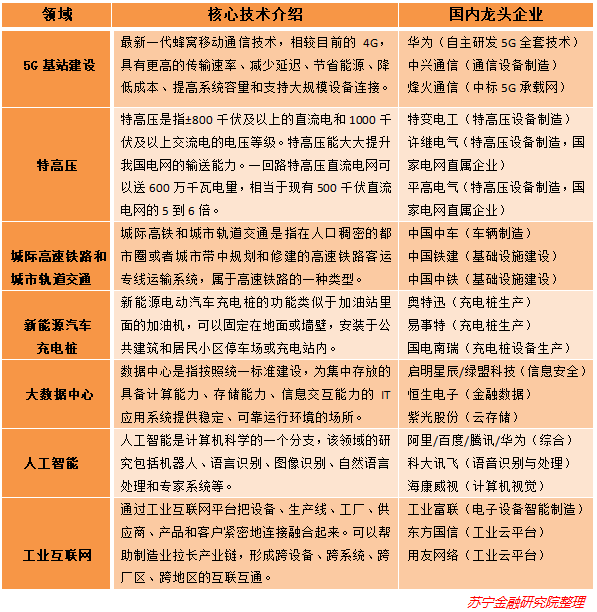 第二,行之有效的经济刺激计划(新基建/西部大开发)。在“新基建”方面,覆盖5G基站建设、特高压、人工智能、工业互联网等七大领域,为我国经济的可持续发展提供有力支持。截至2020年3月,全国13个省市区发布了2020年重点项目投资计划清单。这份投资清单共包括10326个项目,其中8个省份公布了计划总投资额,共计33.83万亿元。关于“新基建”的各领域核心技术,以及国内龙头企业的情况如下表: